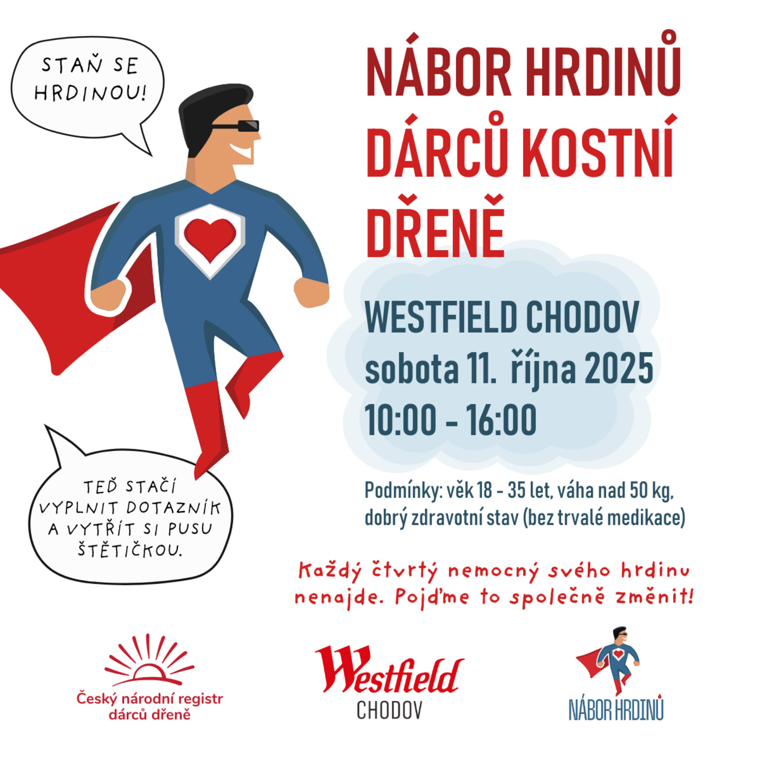 Přijďte v sobotu 11. října 2025 od 10:00 do 16:00 do obchodního centra Westfield Chodov. U stánku dobročinné organizace NÁBOR HRDINŮ se můžete zapsat do Českého národního registru dárců dřeně a stát se tak potenciálním zachráncem života.